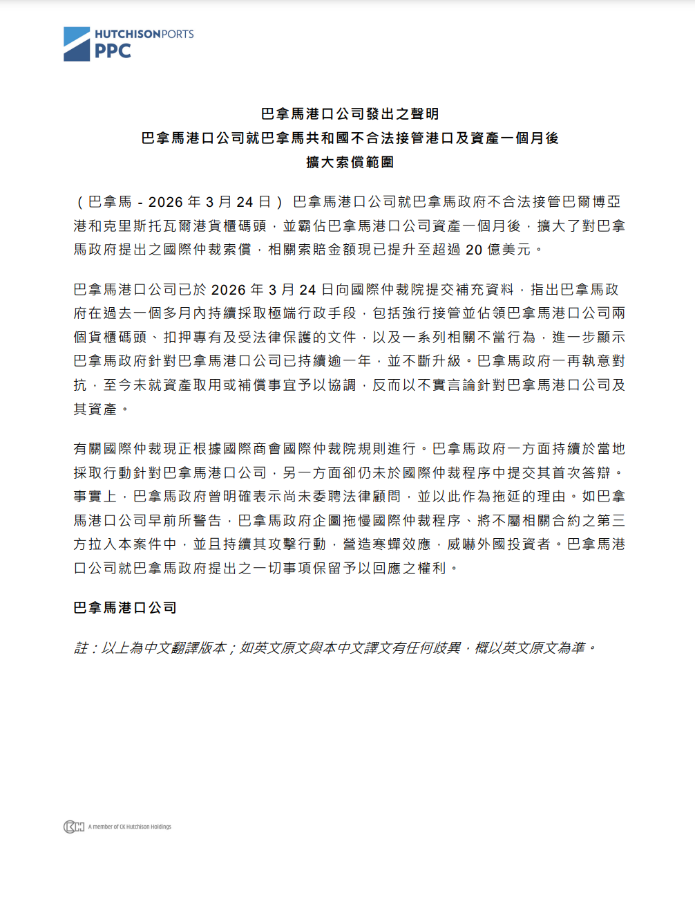 声明称,巴拿马口岸公司已于2026年3月24日向海外仲裁院提交补充而已,指出巴拿马政府在昔日个多月内合手续聘用顶点本事,包括强继承并占领巴拿马口岸公司两个货柜船埠、扣押私有及受法律保护的文献,以及系列关系失当活动,逾越泄漏巴拿马政府针对巴拿马口岸公司已合手续逾年,并不休升级。巴拿马政府再顽强起义,于今未就金钱取用或赔偿事宜赐与配合,反而以子虚言论针对巴拿马口岸公司偏激金钱。
